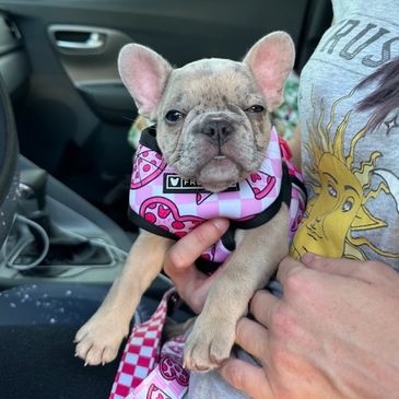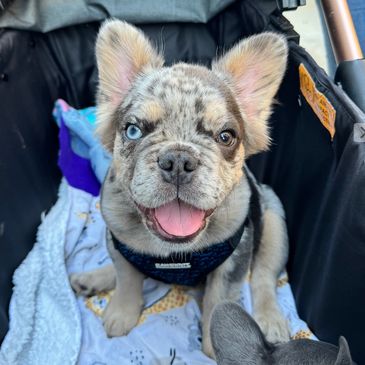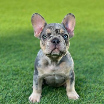 This is our boy Tiesto, he is a full fluffy blue and tan merle boy! Its very easy to tell between a fluffy and a short haired frenchie after 2 weeks of age. To see more photos of him, click here. To be a fluffy a puppy will need to carry 2 recessive genes. Tiesto, has two copies of the l4 long-hair allele, which means he will have longer than average hair per the breed standard. There are different long-hair alleles, the most common is L1 and L4 in Frenchies, visually we have not noticed any differences between dogs that have the 1 or the 4.